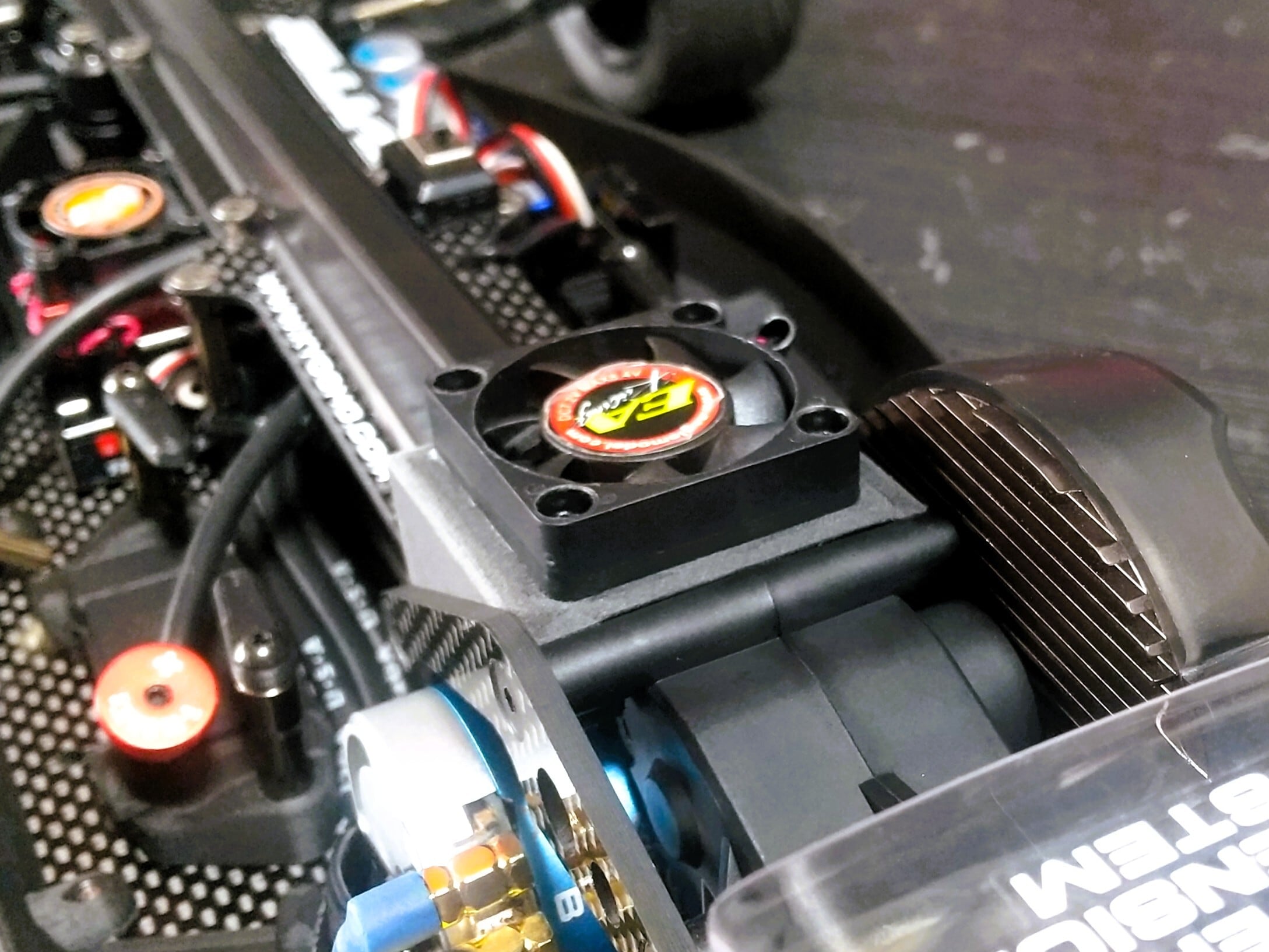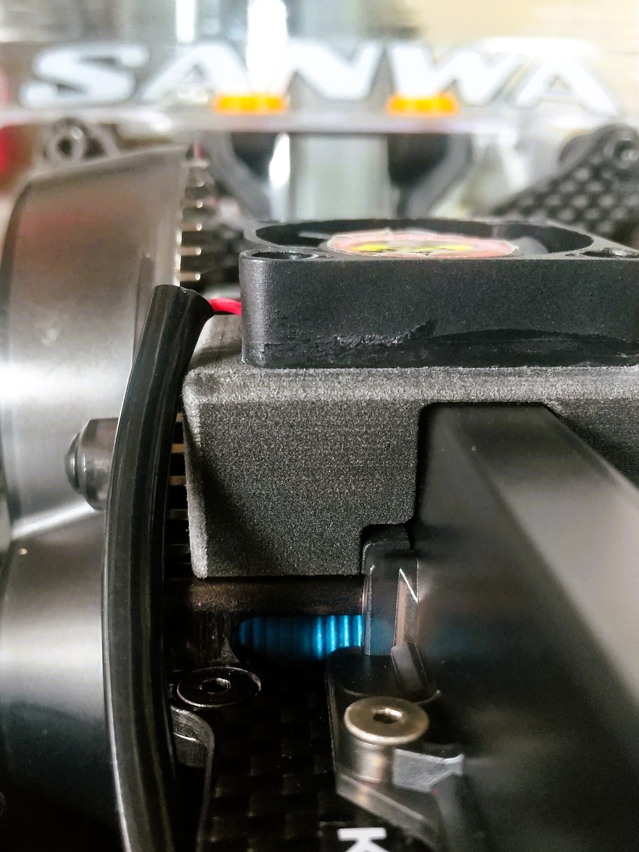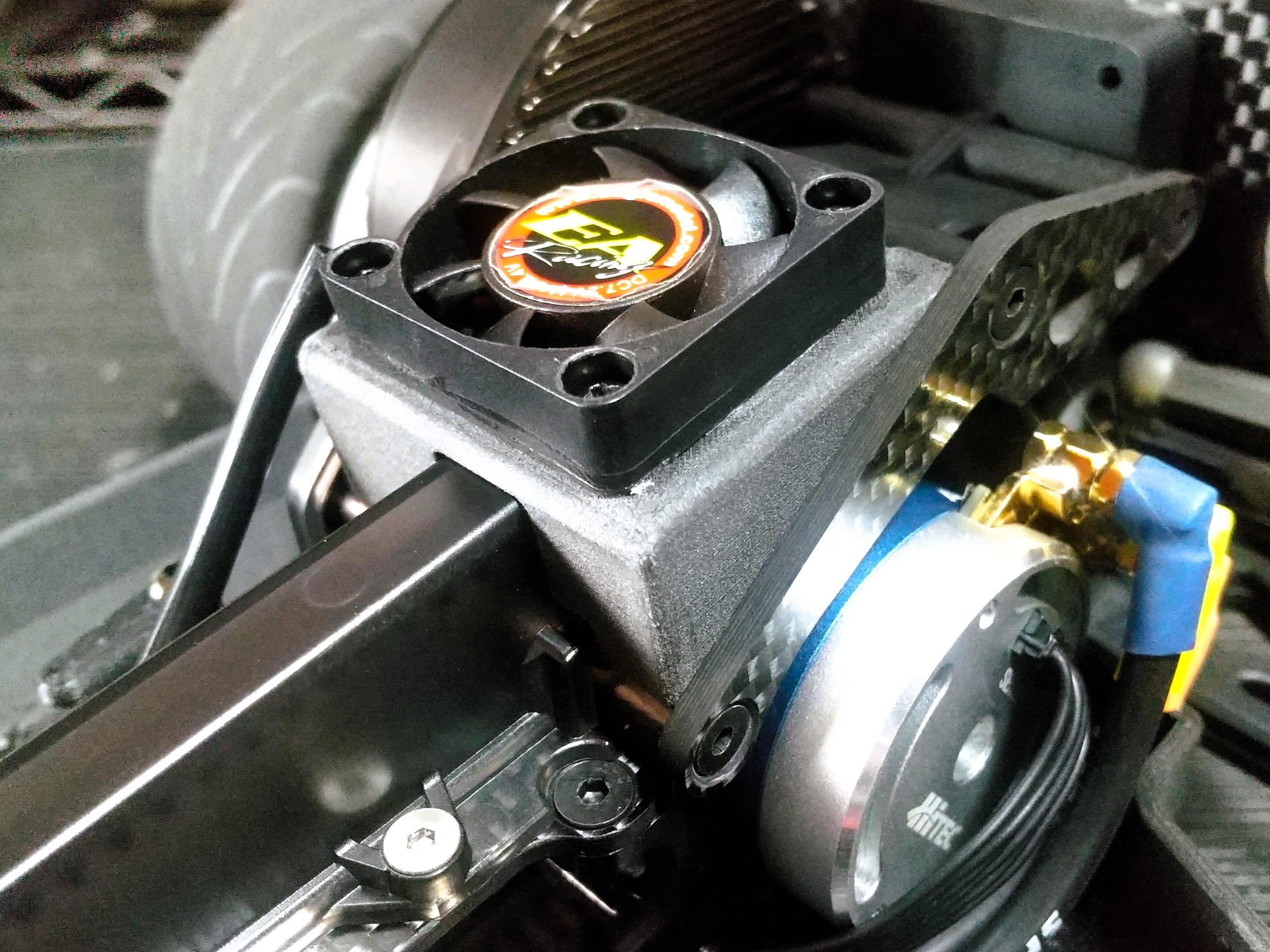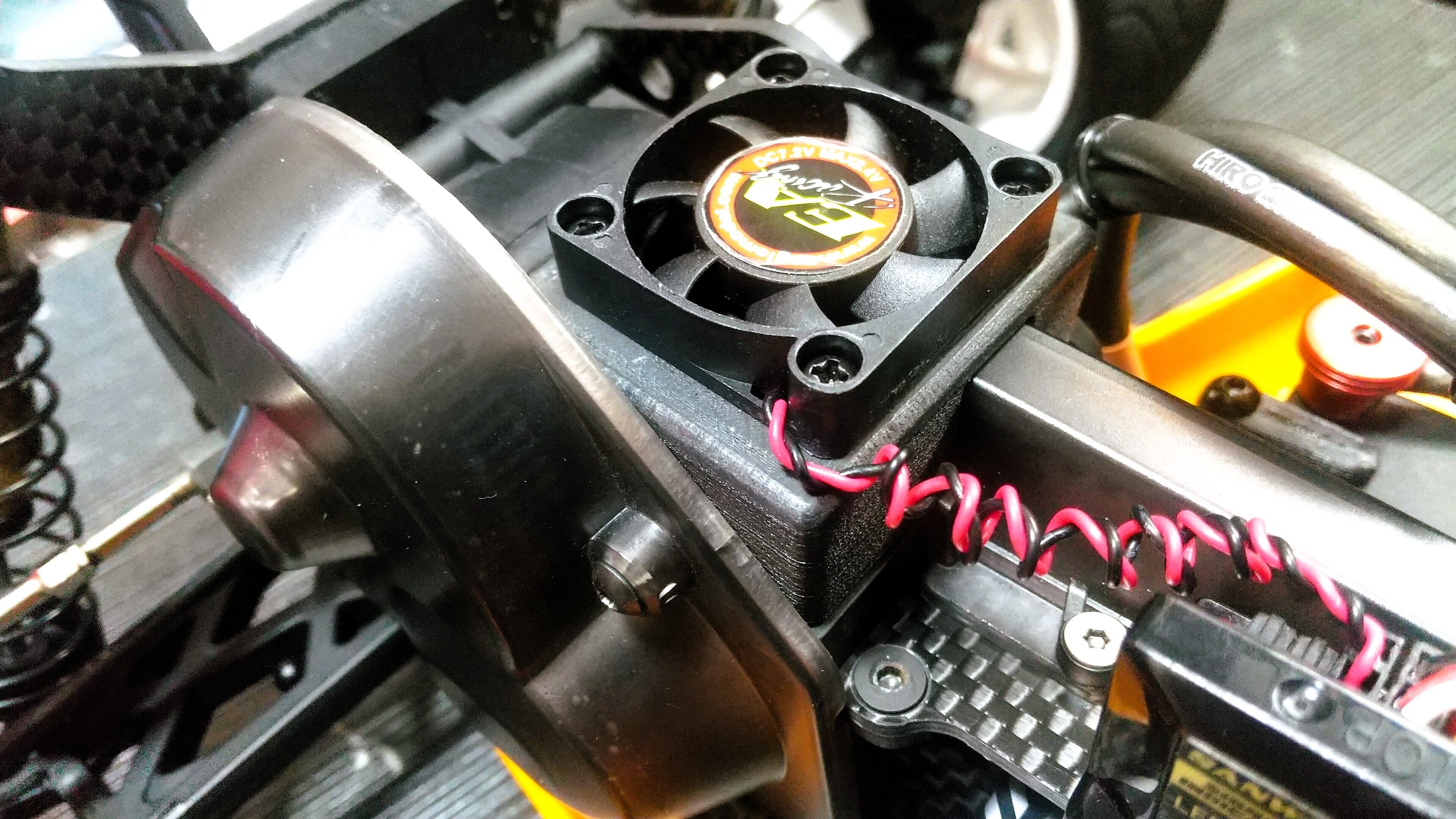 京商オプティマミッド系車両に30mmクーリングファンを取り付けるブラケットです。